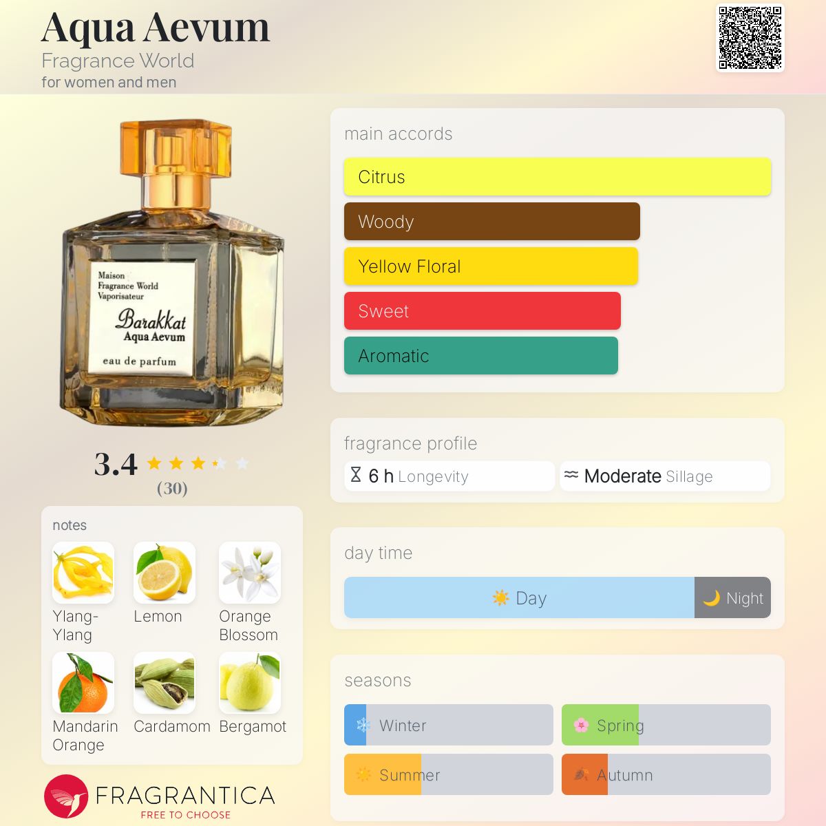 • Top Notes: Lemon, Sicilian Mandarin, Bergamot, Guatemalan Cardamom, Ceylon Cinnamon, Pink Pepper