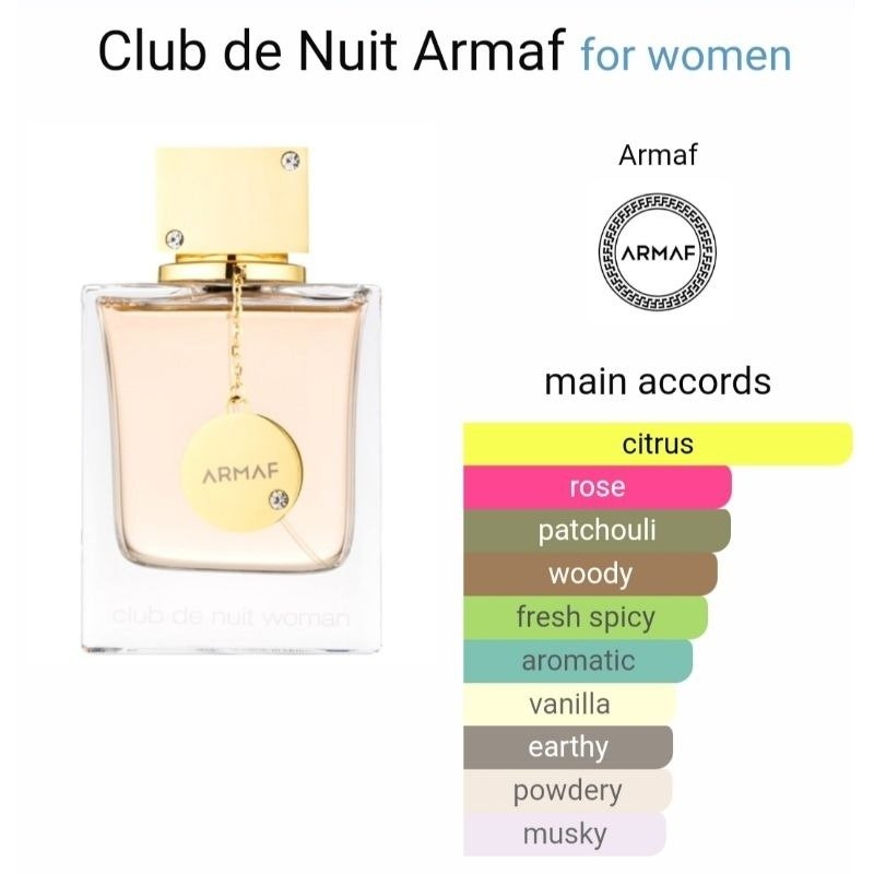 Club de Nuit by Armaf is a Floral Fruity fragrance for women. Top notes are Orange, Grapefruit, Bergamot, Peach; middle notes are Rose, Jasmine, Geranium, Litchi; base notes are Patchouli, Vanilla, Musk,Vetiver.
