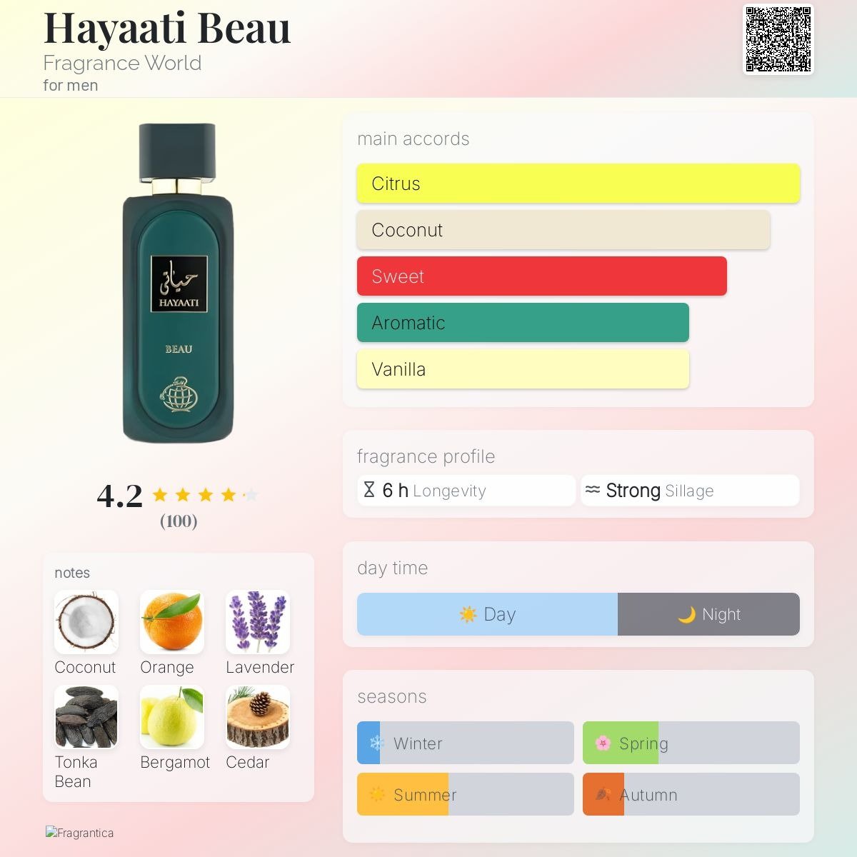Hayaati Beau is a sophisticated and exotic fragrance that beautifully blends fresh, spicy, and warm notes for a scent that feels both luxurious and intriguing. Designed for those who appreciate complex and statement-making perfumes, this Eau De Parfum delivers depth, elegance, and lasting allure.
