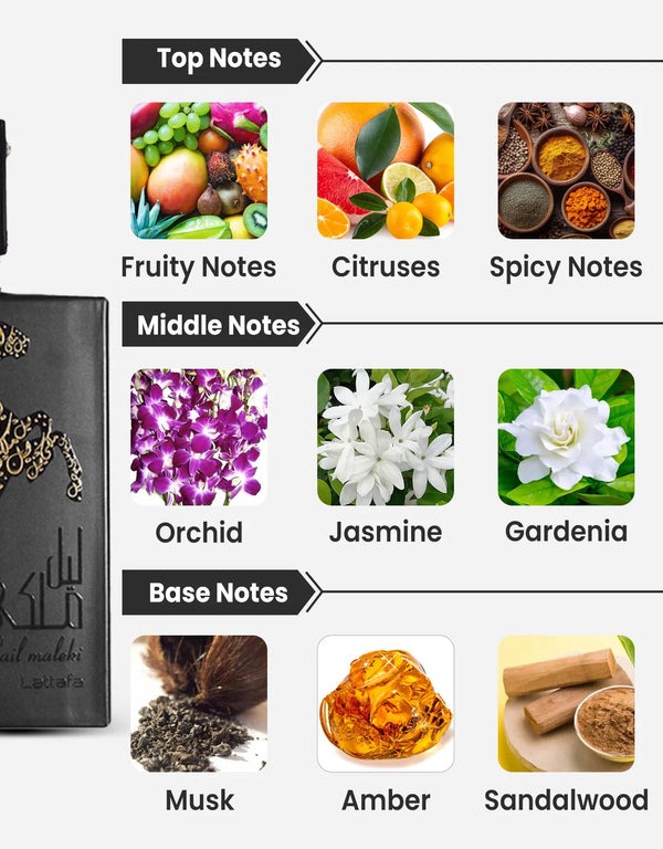 Lail Maleki opens with an invigorating blend of spices and citrus, delivering a lively mix of warmth and freshness. As it develops, the heart reveals a rich, velvety fusion of honey and orchid, enhanced by soft floral nuances for a creamy, indulgent feel. The dry down is deep and addictive, with caramel adding sweetness, while amber and sandalwood provide a warm, resinous base. The result is a long-lasting fragrance that remains vibrant on the skin for over 10 hours, leaving a memorable, elegant trail.