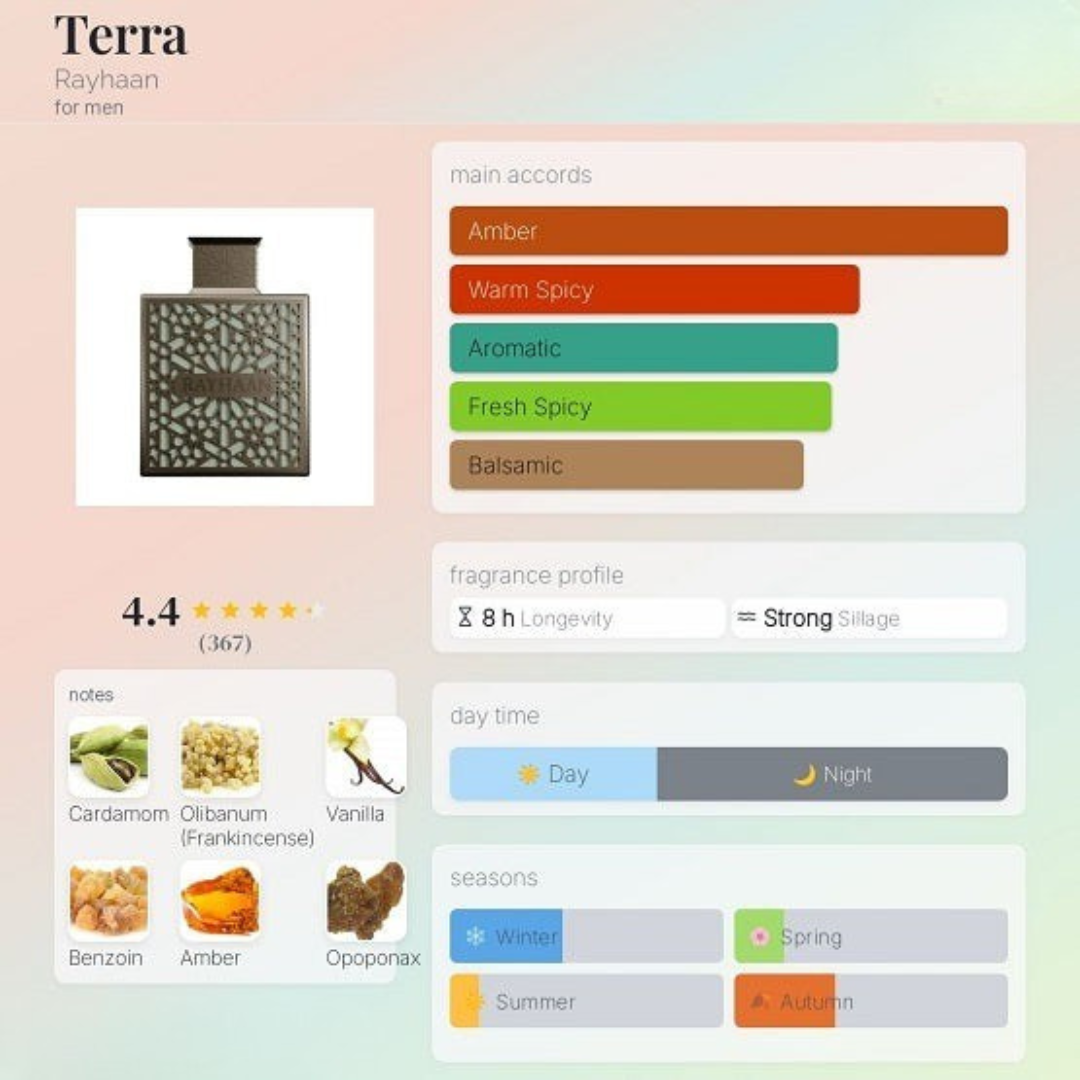 The fragrance opens with cardamom, bergamot, elemi, Sichuan pepper, and lemon, creating a vibrant spicy introduction with citrus brightness. The heart develops through patchouli, coriander, anise, cumin, geranium, saffron, orange blossom, wormwood, and rose, adding aromatic depth with refined complexity. The base settles into vanilla, frankincense, benzoin, amber, opoponax, labdanum, maltol, birch, musk, oud, and ambergris, giving Rayhaan Terra 100ml Wholesale a rich oriental finish with lasting warmth and masculine depth.
